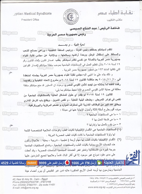أرسل نقيب الأطباء الدكتور حسين خيرى، نداء وطلب مقابلة رئيس الجمهورية عبد الفتاح السيسى، وذلك لمناشدته بالتدخل لإلغاء القانون رقم 19 لسنة 2018 بشأن تنظيم العمل فى المستشفيات الجامعية ولائحته التنفيذية حيث تم رفضهما رفضًا قاطعاً، لما يمثلانه من تهديد للمنظومة العلاجية والتعليمية والطبية فى مصر.