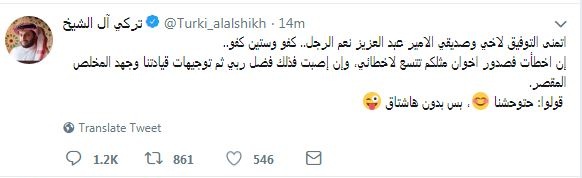 وكتب تركي آل الشيخ عبر حسابه الرسمي بتويتر: اتمنى التوفيق لاخي وصديقي الامير عبد العزيز نعم الرجل.. كفو وستين كفو.. إن اخطأت فصدور اخوان مثلكم تتسع لاخطائي، وإن إصبت فذلك فضل ربي ثم توجيهات قيادتنا وجهد المخلص المقصر... قولوا: حتوحشنا، بس بدون هاشتاق.
