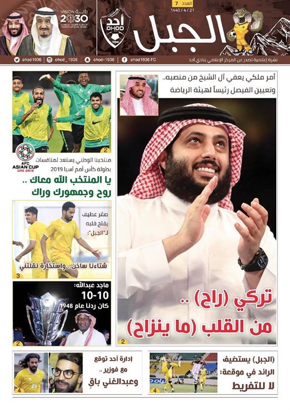 حرصت مجلة نادي أحد "الجبل" التي تصدر عن المركز الإعلامي للنادي على الإشادة بمعالي المستشار تركي آل الشيخ بعد تقديم الأخير لاستقالته من منصب رئيس مجلس إدارة اللجنة الأولمبية العربية السعودية، مساء اليوم الخميس من بشكل رسمي.