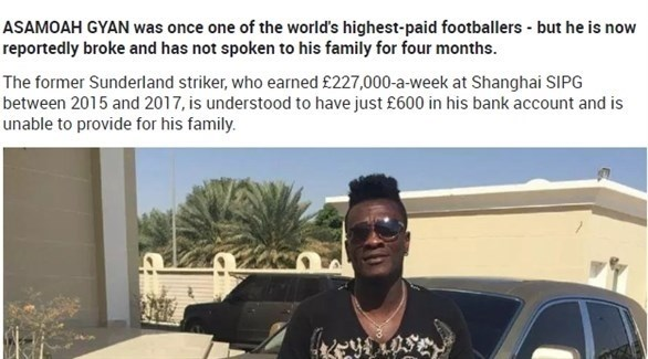 وقالت صحيفة "ذا صن" البريطانية، إن اللاعب الغاني الدولي السابق يملك 600 جنيه إسترليني فقط في حسابه البنكي في تركيا في الوقت الحالي.
