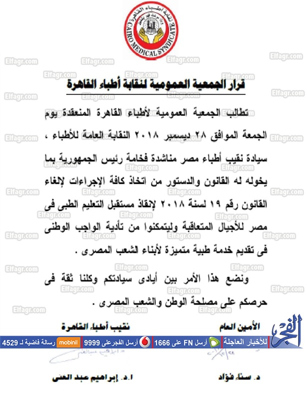 توصيات عمومية أطباء القاهرة: تكليف نقيب الأطباء بمناشدة الرئيس لإلغاء قانون المستشفيات الجامعية