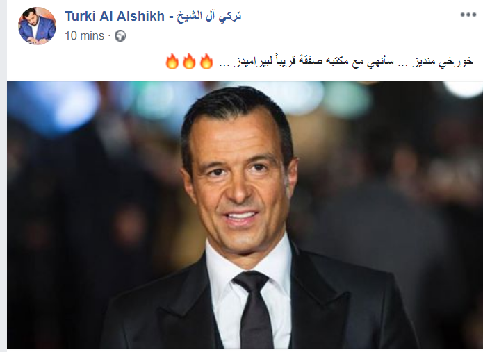 أعلن المستشار تركي آل الشيخ رئيس هيئة الترفيه في المملكة العربية السعودية أنه بصدد إنهاء صفقة قريبة لنادي بيراميدز عن طريق خورخي مينديز وكيل أعمال كريسيتانو رونالدو نجم يوفنتوس الإيطالي.