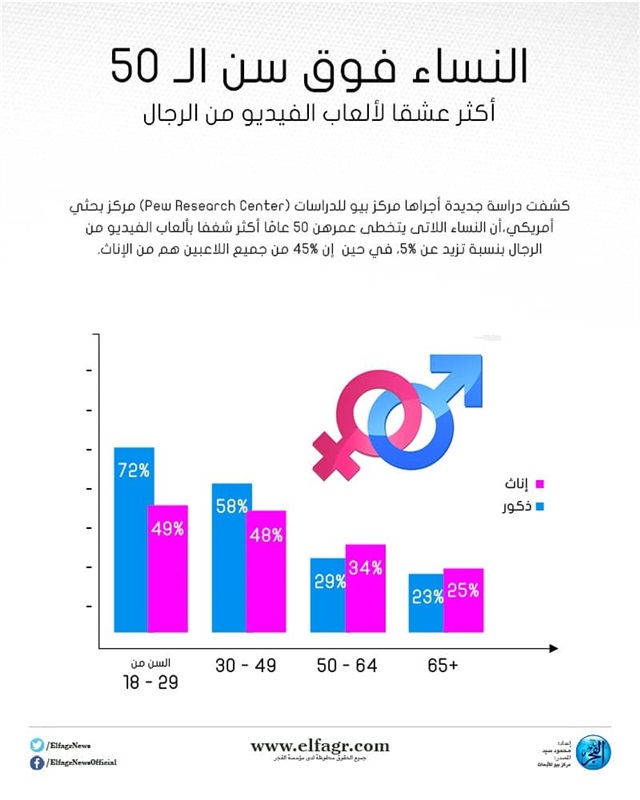 النساء فوق سن ال50 أكثر عشقا لألعاب الفيديومن الرجال (انفوجراف) انفوجراف الثلاثاء 29/يناير/2019 - 06:04 م 1/29/2019 6:04:00 PM سن ال50 النساء العاب الفيديو الرجال