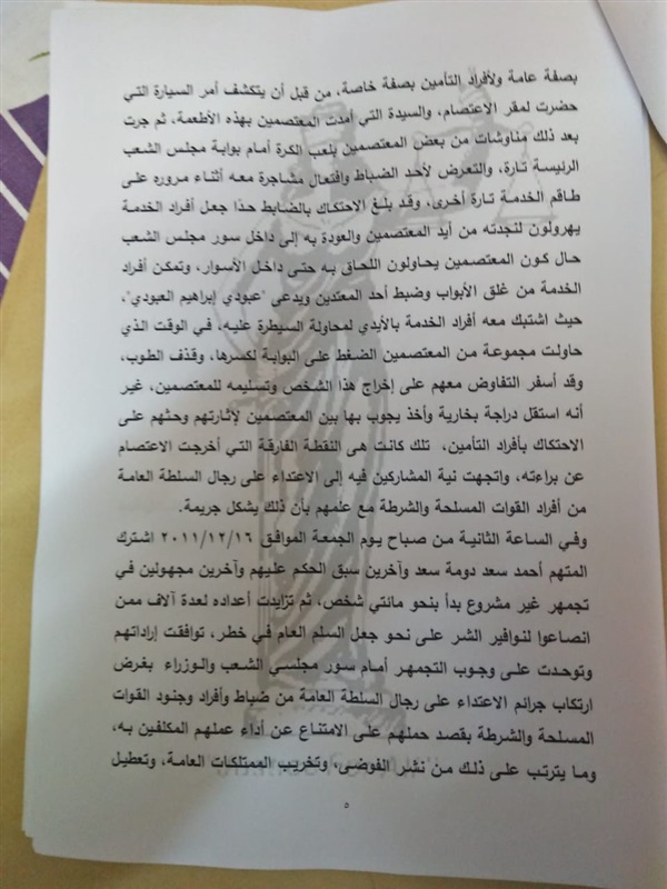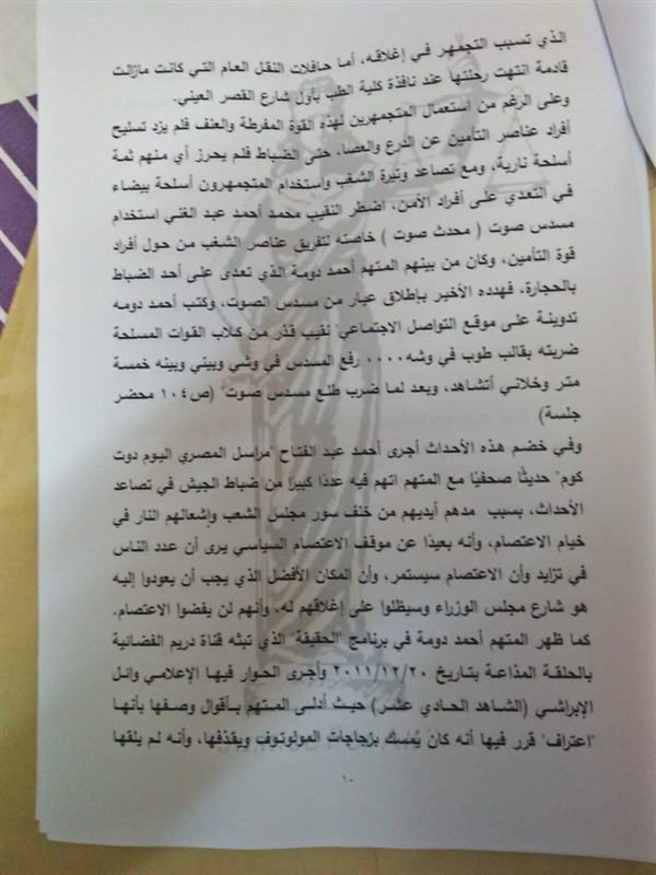 واستكملت الحيثيات، في الساعة الثانية من صباح يوم الجمعة ديسمبر أشترك المتهم أحمد سعد دومة سعد وآخرين سبق الحكم عليهم وآخرين مجهولين في تجمهر غير مشروع بدأ نحو مائتي شخص، ثم تزايدت أعداده لعدة آلاف ممن انصاعوا لنوافير الشر علي نحو جعل السلم العام في خطر، توافقت إرادتهم وتوحدت علي وجوب التجمهر أمام سور مجلسي الشعب والوزراء بغرض ارتكاب جرائم الاعتداء علي رجال السلطة العامة من ضباط وأفراد وجنود القوات المسلحة والشرطة بقصد حملهم علي الامتناع عن أداء عملهم المكلفين به.