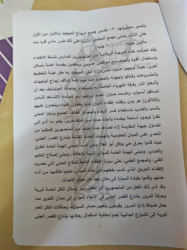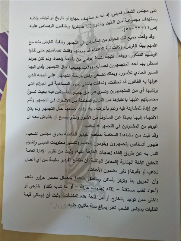 وقد وقعت جميع تلك الجرائم من المشاركين في التجمهر وتنفيذا للغرض منه مع علمهم بهذا الغرض، وكانت نية الاعتداء قد جمعتهم وظلت تصاحبهم حتي نفذوا غرضهم المذكور، ووقعت نتيجة نشاط اجرامي من طبيعة واحدة، وقد ثبت من مشاهدة المحكمة لمقاطع الفيديو الخاصة بحرق مجلس الشعب، ظهور اشخاص يتجمهرون ويقومون بتحطيم وتكسير محتويات المبني وإضرام النار به عن طريق إلقاء زجاجات الحارقة علي،وثبت من تقرير الادارة العامة لتحقيق الادلة الجنائية ان مقاطع الفيديو سليمة من أي أعمال تلاعب أو فبركة تغير مضمون الاحداث، وان الحريق بدأ وتركز بأماكن ومناطق متعددة بإيصال مصدر حراري متعدد "اعواد ثقاب مستقلة - إلقاء زجاجات حارقة - أو ماشابه هذا" خارجي او داخلي ممن تواجد بالخارج أو من فتحة هذه المنشآت وثبت أن اجمالي قيمة التلفيات بمجلس الشعب تقدر بمبلغ ستة ملايين جنيه.
