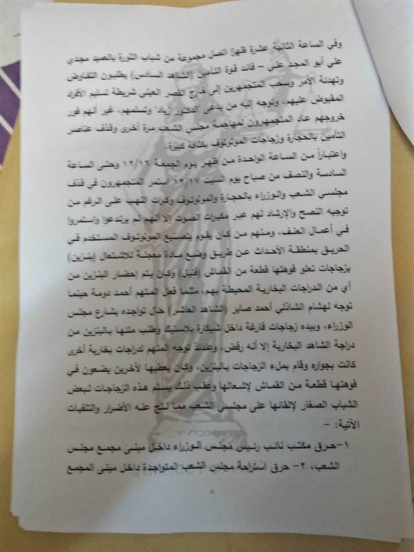 واعتبارا من الساعة الواحدة من ظهر يوم الجمعة 16 ديسمبر وحتي الساعة السادسة والنصف من صباح يوم السبت 17 ديسمبر، استمر المتجمهرون في قذف مجلسي الشعب والوزراء بالحجارة والمولوتوف وكرات اللهب علي الرغم من توجيه النصح والارشاد لهم عبر مكبرات الصوت الا انهم لم يرتدعوا واستمروا في اعمال العنف، ومنهم من كان يقوم بتصنيع المولوتوف المستخدم في الحريق بمنطقة الاحداث عن طريق وضع مادة معجلة للاشتعال "بنزين" بزجاجات تعلو فوهتها قطعة من القماش "قتيل" وكان يتم احضار البنزين من اي من الدراجات البخارية المحيطة بهم، مثلما فعل المتهم أحمد دومة حينما توجه لهشام الشاذلي أحمد صابر "الشاهد العاشر" حال تواجده بشارع مجلس الوزراء، وبيده زجاجات فارغة داخل شيكارة بلاستيك وطلب ملئها بالبنزين من دراجة الشاهد البخارية الا انه رفض، وعندئذ توجه المتهم لدراجات بخارية اخري كانت بجواره وقام بملء زجاجات البنزين، وكان يعطيها لآخرين يضعون في فوهتها قطعة من القماش لإشعالها وعقب ذلك تسليمها لبعض الشباب الصغار لإلقائها علي مجلسي الشعب والوزراء مما نتج عنه الاضرار والتلفيات.