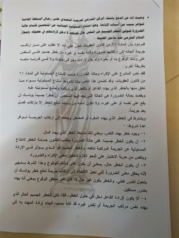 وجاء بالحيثيات، حيث أنه عن الدفع بإنتفاء الركن الشرعي لجريمة التعدي علي رجال السلطة العامة لتوافر سبب من أسباب الإباحة، وهو امتناع المسئولية الجنائية عن المتهمين لقيام حالة الضرورة لتوقي الخطر الجسيم عن النفس حال كونهم لا دخل لإرادتهم في حصوله وجواز الدفاع الشرعي ضد مأمور الضبط، فمردوده بأن المادة 61 من قانون العقوبات تنص علي أنه "لا عقاب علي من أرتكب جريمة ألجأته إلي ارتكابها ضرورة وقاية نفسه أو غيره من خطر جسيم علي النفس علي وشك الوقوع به أو بغيره ولم يكن لإرادته دخل في حلوله ولا في قدرته منعه بطريقة أخري.
