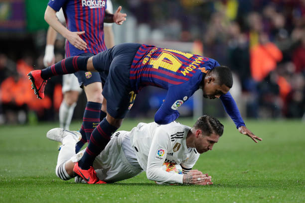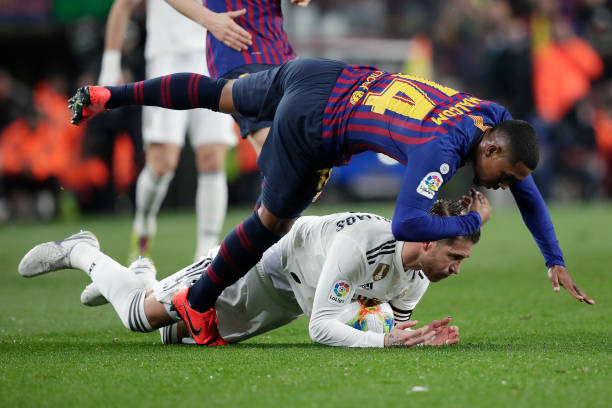 حاول سيرجيو راموس مدافع نادي ريال مدريد إصابة مالكوم نجم برشلونة خلال مباراة الكلاسيكو بين الفريقين أمس في ذهاب نصف نهائي كأس ملك إسبانيا.