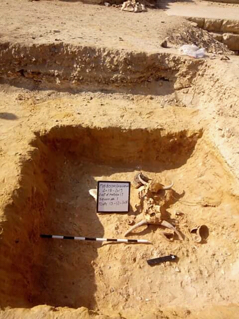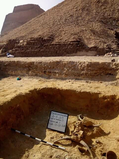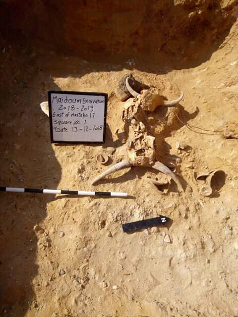 وأشار الدكتور مصطفي وزيري، إلى أن أعمال الحفائر بالمنطقة أسفرت عن كشف عدد من القطع الأثرية منها، قرابين جنائزية في جهة الشرق من المصطبة رقم 17، وهي عبارة عن اثنين من الرؤوس الحيوانية، يرجح أنهما ثيران، بجوارهم ثلاثة أواني رمزية صغيرة مصنوعة من الفخار ومحكمة الغلق بورق البردي، مشيرًا إلى أن البعثة تقوم الآن بدراستها.