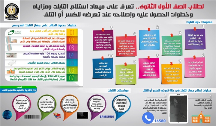 نشر المركز الإعلامي لمجلس الوزراء، إنفوجراف عن أبرز المعلومات بشأن استلام طلاب الصف الأول الثانوي التابلت، وكشف المركز الإعلامي عن بدء توزيع التابلت على الطلاب بداية من الفصل الدراسي الثاني، مضيفاً أن التابلت الذى سيسلم للطلاب سيكون عهدة شخصية لحين انتهاء الدراسة بمرحلة الثانوية العامة ويعتبر بعدها هدية مجانية للطلاب، ولا يرده الطالب إلا في حال تحويله لنظام تعليمي آخر، علماً بأن الفئات المستهدفة بالتابلت هم طلاب الصف الأول الثانوي بالمدارس الحكومية والخاصة والمعلمين والعاملون بالمديريات التعليمية.