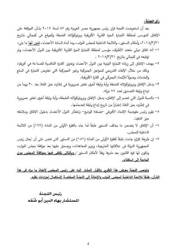 يناقش مجلس النواب، برئاسة الدكتور على عبد العال، تقـرير لجنـة الشئـون الدستــورية والتشــريـعـية، عـن طريقة إقرار الموافقة على الاتفاق المؤسس لمنطقة التجارة الحرة القارية الأفريقية وبرتوكولاته الملحقة، والموقع في كيجالي بتاريخ 21 3 2018، والصادر بها قرار رئيس جمهورية مصر العربية رقم 87 لسنة 2019، والتي انتهى الرأي لعدم مخالفتها الدستور، على أن تتم إحالتها للجان المختصة لدراستها من النواحي الفنية.