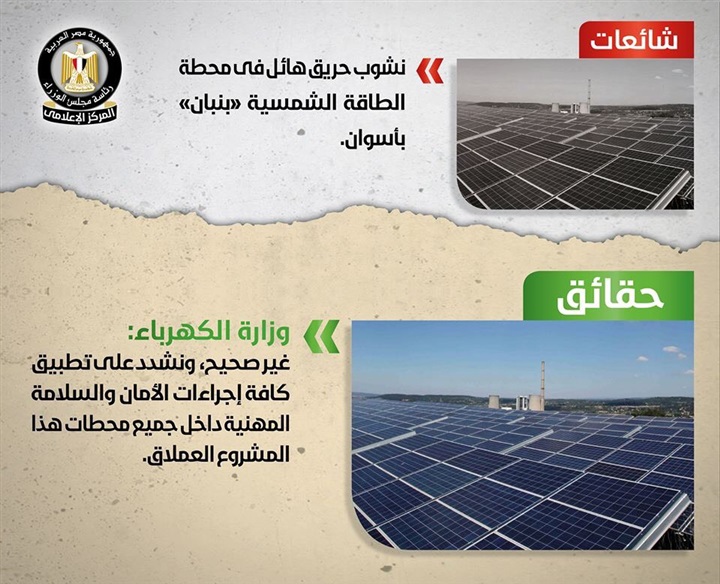 ونفي المركز ما تداول حول نشوب حريق هائل في محطة الطاقة الشمسية "بنبان" بأسوان، ونفي ما اثير حول إلزام المقبلين على الزواج باجتياز دورات تدريبية ضمن برنامج "مودة".