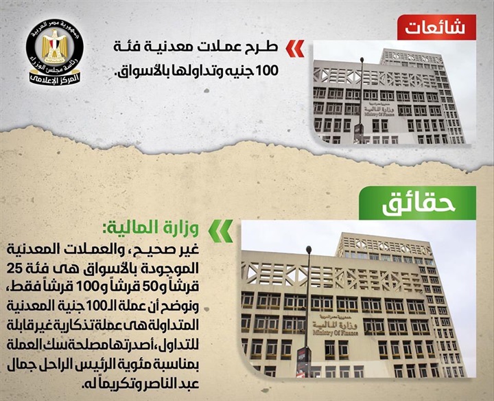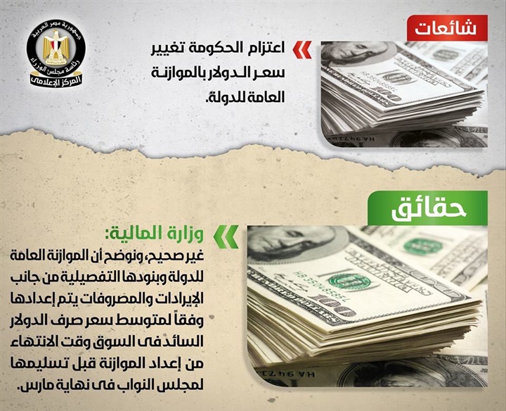 حيث نفى المركز ما تداول حول إصدار قانون منفرد للفاتورة الإلكترونية كما نفى طرح عملات معدنية فئة 100جنيه وتداولها بالأسواق ونفى ما تداول حول اعتزام الحكومة تغيير سعر الدولار بالموازنة العامة للدولة.