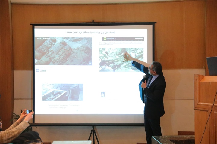 وخلال المحاضرة عرض الدكتور خالد العناني سلسلة من أهم الاكتشافات الأثرية التى قامت بها وزارة الآثار خلال العامين السابقين والاهتمام العالمي والإعلامي بمتابعة كل ما هو جديد عن الحضارة المصرية القديمة.
