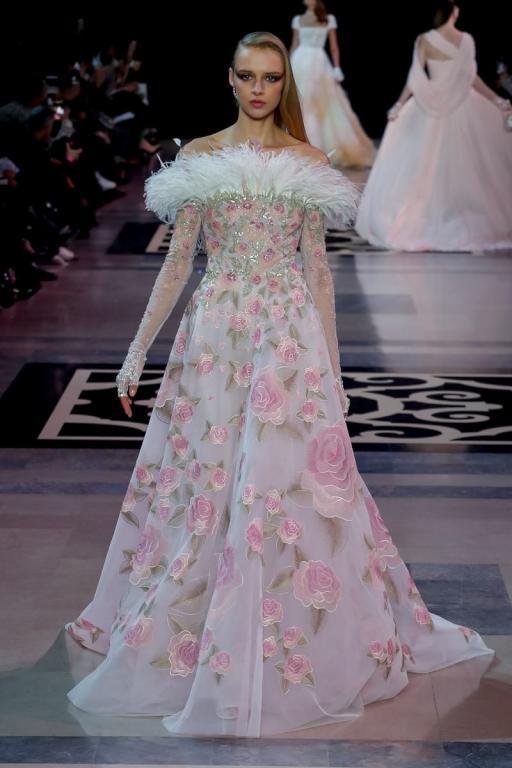 وتألقت عارضات أزياء جورج حبيقة Georges Hobeika بفساتين الريش الآسرة للقلوب، الفستان الأول بأكمام طويلة وأكتاف منسدلة Off Shoulder ومزين بالورود الناعمة على الفستان مع لمسات الريش على الصدر.
