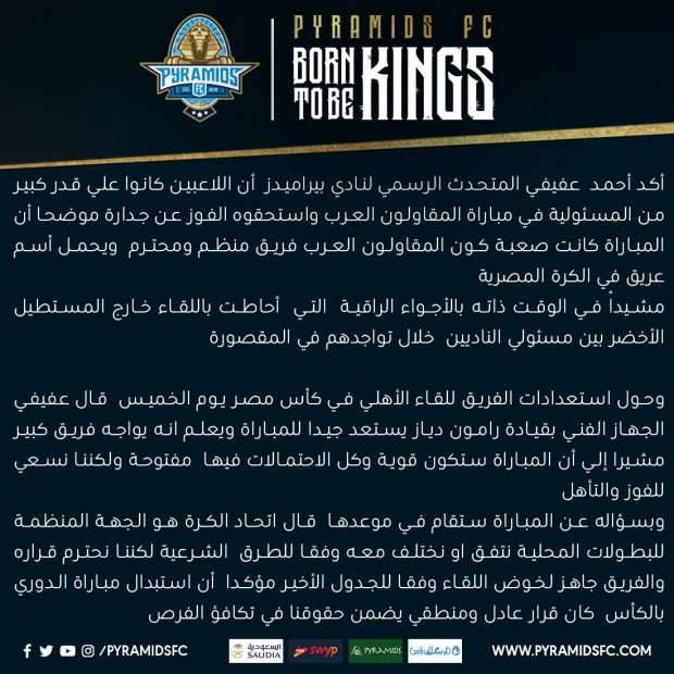 عاجل.. بيان جديد من بيراميدز قبل مواجهة الأهلي (صورة)