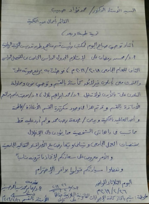 تعدى صباح اليوم، الدكتور "م. ر" أستاذ بكلية التربية الرياضية، داخل مكتبه على الدكتور عابر أستاذ طرق التدريس بالكلية، حيث أثناء مطالبة الأخير بضرورة تدعيم وحشد طلاب الكلية لمعرفة المشروعات القومية التي تقوم بها الحكومة خلال الفترة الأخيرة وذلك لنبذ العنف والإرهاب الفكري لدي الطلاب وعند مواجهته بهذا الأمر وجده يتهجم عليه رافضا ذلك حيث علل الرفض بأن طلاب كلية تربية رياضية خارج مجتمع التنمية والتطوير.