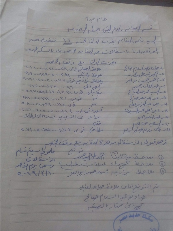 ونصت الاستقالات على: السيد رئيس النقابة بغرب الدلتا لجنة 16، نتقدم نحن الموقعين ادناه باستقالات من النقابة الخاصة بنا بالسكة الحديد بغرب الدلتا مع المطالبة بوقف الخصم".