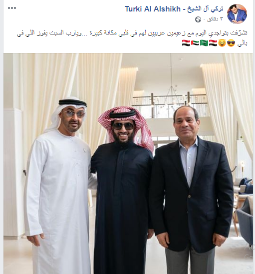 قام معالي المستشار تركي آل الشيخ رئيس الهيئة العامة للترفيه بالمملكة العربية السعودية بنشر صورة له عبر حسابه الشخصي على موقع التواصل الإجتماعي "فيسبوك" بصحبة الرئيس عبد الفتاح السيسي و محمد بن زايد آل نهيان ولي عهد أبوظبي.