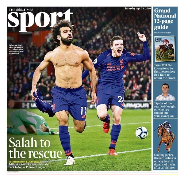 وقالت صحيفة "التايمز"، في عنوان "صلاح إلى الإنقاذ"، وتابعت "هدف فردي مذهل يرسل فريقه إلى قمة البريمير ليج".