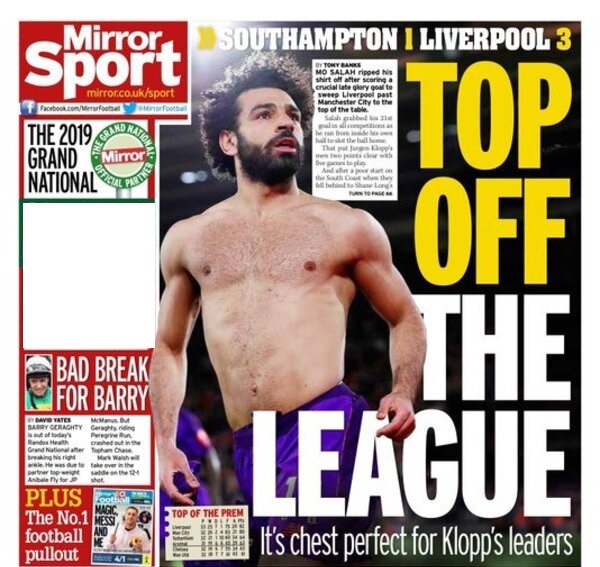 ونشرت صحيفة "ميرور" صورة كبيرة لصلاح الذي خلع قميصه احتفالا بالهدف، وقالت في عنوان "قمة الدوري".