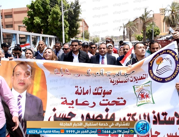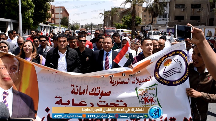 رئيس جامعة بني سويف يقود مسيرة للطلاب المغتربين للمشاركة في الاستفتاء على التعديلات الدستورية (صور)