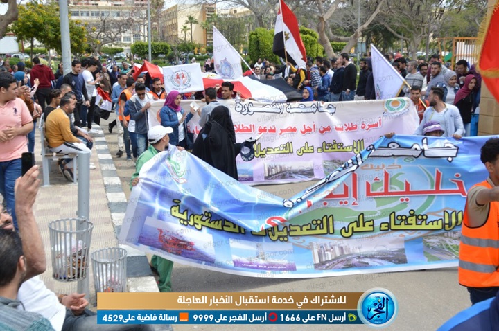 نظمت جامعة المنضورة خلال اليوم الثانى للاستفتاء على التعديلات الدستورية مسيرة حاشدة بعنوان انزل – شارك مستقبلك بين ايديك بمشاركة الالاف من طلاب جامعة المنصورة وأعضاء هيئة التدريس والعاملين