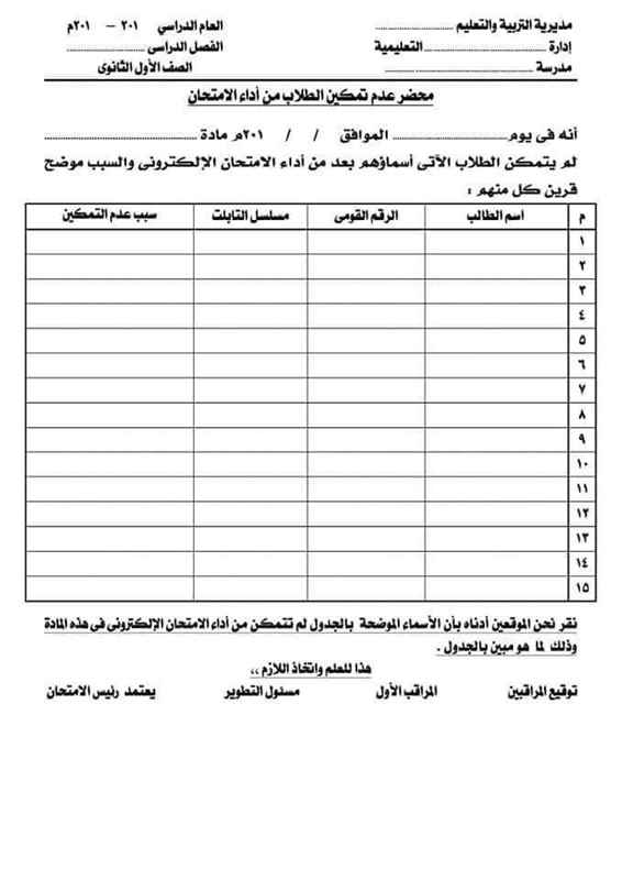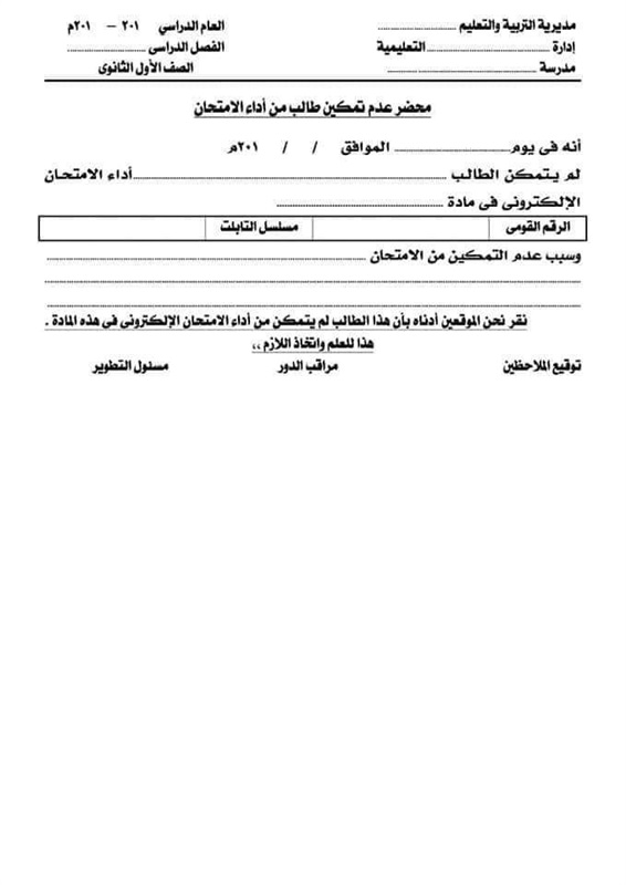 حصلت "الفجر" على نسخة من المحضر الرسمي الذي أعدته وزارة التربية والتعليم والتعليم الفني لطلاب الصف الأول الثانوي في حالة عدم تمكنه من أداء الامتحان؛ لأسباب تقنية وذلك خلال الامتحانات الالكترونية المقرر عقدها لطلاب الصف الأول الثانوي في مايو المقبل.