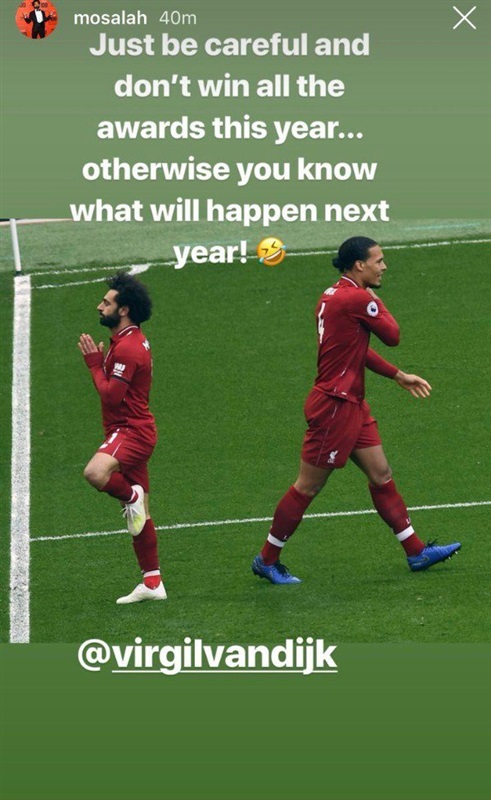 هنأ محمد صلاح نجم نادي ليفربول الإنجليزيزميله فيرجيل فان ديك على فوزه بجائزة لاعبة الموسم في الدوري الإنجليزي برأي اللاعبين المحترفين