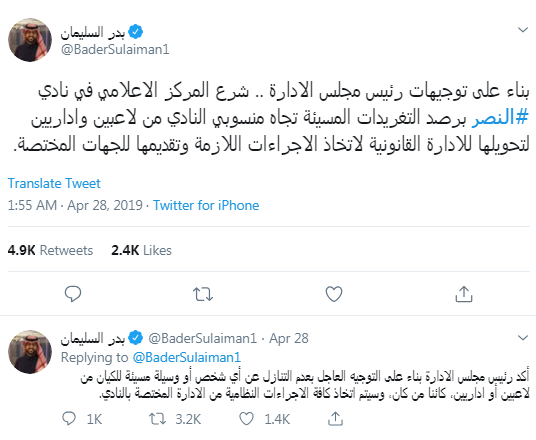 وقال بدر السليمان، المتحدث الرسمي باسم نادي النصر: "بناء على توجيهات رئيس مجلس الادارة.. شرع المركز الاعلامي في نادي النصر برصد التغريدات المسيئة تجاه منسوبي النادي من لاعبين واداريين لتحويلها للادارة القانونية لاتخاذ الاجراءات اللازمة وتقديمها للجهات المختصة".