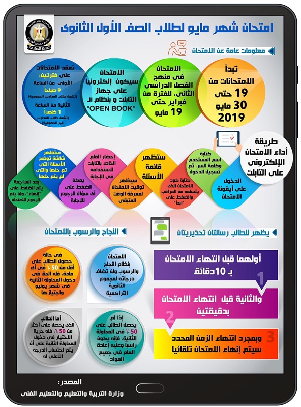 نشر المركز الإعلامي لمجلس الوزراء، إنفوجرافاً سلط من خلاله الضوء على أهم المعلومات المتعلقة بامتحان شهر مايو لطلاب الصف الأول الثانوي، معلناً أنه سيتم بدء الامتحانات من 19 حتى 30 مايو 2019، وسيكون إلكتروني على جهاز التابلت، بنظام الـ "open book"، فضلاً عن أنه سيكون في منهج الفصل الدراسي الثاني، للفترة من فبراير حتى 19 مايو.