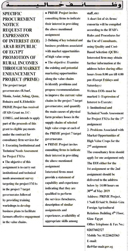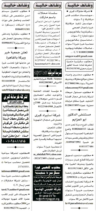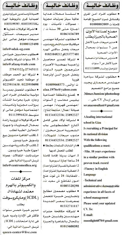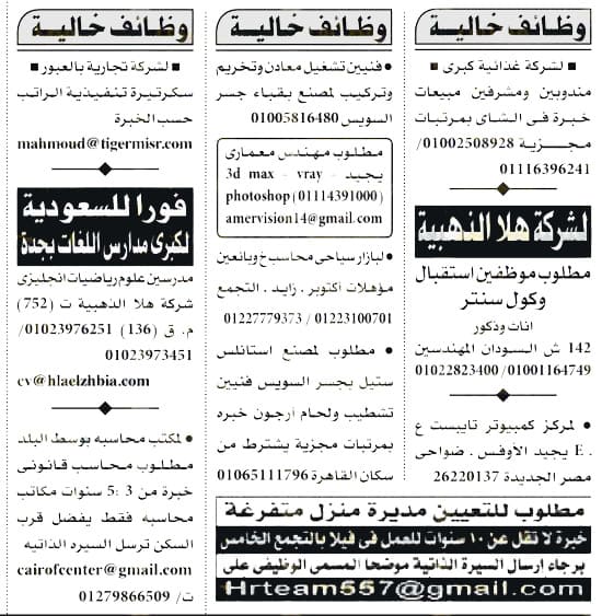 ننشر الوظائف الخالية المنشورة اليوم ضمن العدد الأسبوعي لجريدة الأهرام ليوم الجمعة 17 مايو 2019، ومئات الوظائف في عدد كبير من التخصصات داخل مصر، وفرص عمل شاغرة للمصريين في دول الخليج (المملكة العربية السعودية ودولة الإمارات العربية المتحدة وسلطنة عمان والكويت ودولة قطر والبحرين).