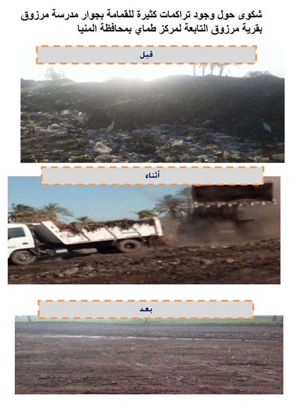 وحول موقف تنفيذ تكليف التعامل مع تجمعات القمامة، أشار الدكتور طارق الرفاعي إلى أن المنظومة استقبلت أكثر من 120 ألف رسالة وصورة منذ بدء التكليف في أكتوبر 2018 حتى 30/4/2019، تم ترجمتها إلى عدد 11938 شكوى عن أماكن تجمعات القمامة بمختلف أنحاء الجمهورية، لافتاً إلى أن المُحافظات بأجهزتها المختلفة حققت تفاعلاً كبيراً على كافة المستويات للإستجابة لما ورد برسائل وشكاوى المواطنين، وأسفرت جهود المحافظات عن رفع وإزالة أكثر من 4 ملايين من الأطنان والأمتار المكعبة من تراكمات القمامة والمخلفات تركزت معظمها بمحافظات القاهرة الكبرى.