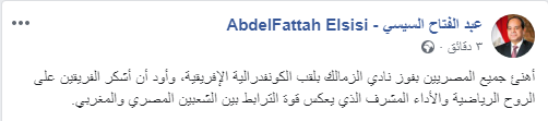 وقال الرئيس: "أهنئ جميع المصريين بفوز نادي الزمالك بلقب الكونفدرالية الإفريقية، وأود أن أشكر الفريقين على الروح الرياضية والأداء المشرف الذي يعكس قوة الترابط بين الشعبين المصري والمغربي".