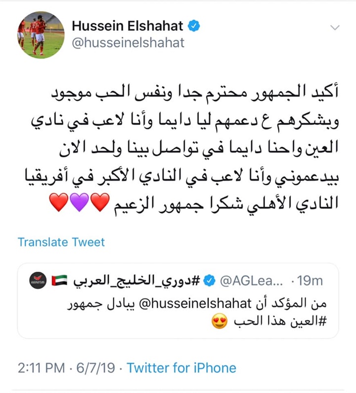 وجه حسين الشحات لاعب الفريق الأول لكرة القدم بالنادي الأهلي، رسالة حب إلى جمهور نادي العين الإماراتي والذي لعب بين صفوفه لمدة موسم.