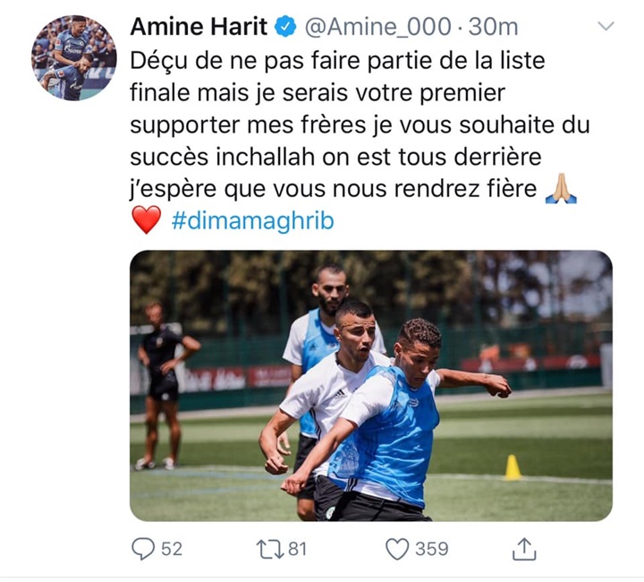 علق أمين حارث لاعب شالكه الألماني ومنتخب المغرب استبعاده من القائمة النهائية لأسود الأطلسي التي تستعد لخوض بطولة أمم إفريقيا بمصر في الحادي والعشرين من الشهر الجاري.