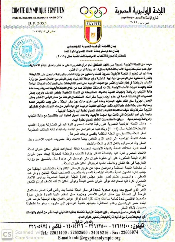 أصدر مجلس إدارة اللجنة الأولمبية بيانا رسميا ينفي فيه كل ما ذكر من مغالطات بشأن عدم المشاركة في دورة الألعاب الشاطئية سال 2019 والتي تم إلغاء المشاركة فيها بقرار رسمي من مجلس إدارة اللجنة الأولمبية بعد الإجتماع الذي عقد بحضور هشام نصر عضو مجلس إدارة اللجنة الأولمبية ورئيس اتحاد كرة اليد وهو ما أكده البيان الصادر من اتحاد كرة اليد.