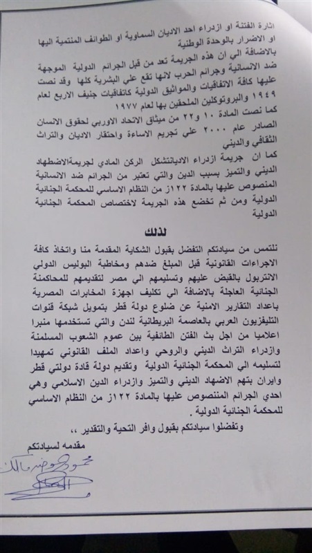 لذلك التمس مقدم البلاغ باتخاذ كافة الإجراءات القانونية قبل المبلغ ضدهم ومخاطبة البوليس الدولي الانتربول بالقبض عليهم وتسليمهم إلي مصر لتقديمهم للمحاكمة الجنائية العاجلة بالإضافة إلي تكليف أجهزة المخابرات المصرية بإعداد التقارير الأمنية عن ضلوع دولة قطر بتمويل شبكة قنوات التليفزيون العربي بالعاصمة البريطانية لندن والتي تستخدمها منبرا إعلاميا من اجل بث الفتن الطائفية بين عموم الشعوب المسلمة وازدراء التراث الديني والروحي وإعداد الملف القانوني تمهيدا لتسليمه إلي المحكمة الجنائية الدولية، وتقديم قادة دولتي قطر وإيران بتهم الاضطهاد الديني والتميز وازدراء الدين الإسلامي وهي احدي الجرائم المنصوص عليها بالمادة 122ز من النظام الأساسي للمحكمة الجنائية الدولية.