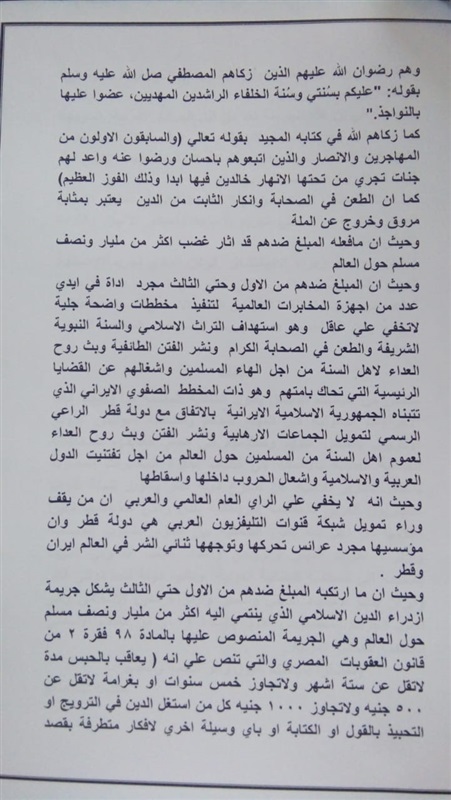 وقال مقدم البلاغ إن مافعله المبلغ ضدهم قد أثار غضب أكثر من مليار ونصف مسلم حول العالم حيث أن المبلغ ضدهم من الأول وحتي الثالث مجرد أداة في أيدي عدد من أجهزة المخابرات العالمية لتنفيذ مخططات واضحة جلية لاتخفي علي عاقل وهو استهداف التراث الإسلامي والسنة النبوية الشريفة والطعن في الصحابة الكرام ونشر الفتن الطائفية وبث روح العداء لأهل السنة من اجل الهاء المسلمين وإشغالهم عن القضايا الرئيسية التي تحاك بأمتهم وهو ذات المخطط الصفوي الايراني الذي تتبناه الجمهورية الإسلامية الإيرانية بالاتفاق مع دولة قطر الراعي الرسمي لتمويل الجماعات الإرهابية ونشر الفتن وبث روح العداء لعموم اهل السنة من المسلمين حول العالم من اجل تفتيت الدول العربية والإسلامية وإشعال الحروب داخلها وإسقاطها.