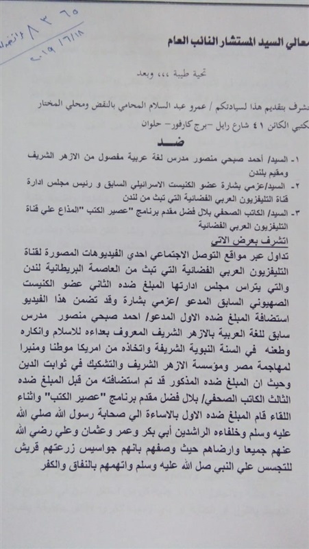 تلقي المستشار نبيل صادق النائب العام، بلاغا من عمرو عبد السلام المحامي بالنقض، ضد أحمد صبحي منصور مدرس لغة عربية مفصول من الأزهر الشريف ومقيم بلندن، وعزمي بشارة عضو الكنيست الإسرائيلي السابق و رئيس مجلس إدارة قناة التليفزيون العربي الفضائية التي تبث من لندن والكاتب الصحفي بلال فضل مقدم برنامج "عصير الكتب "المذاع علي قناة التليفزيون العربي الفضائية، لاتهامهم بازدراء الدين الإسلامي.