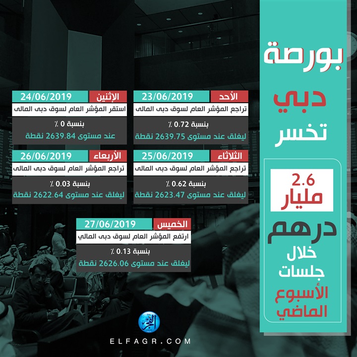 بورصة دبي تخسر 2.6 مليار درهم خلال جلسات الأسبوع الماضي (انفوجراف)