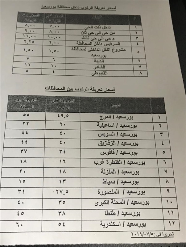 حصلت "الفجر"، على التعريفة الجديدة للمواصلات داخل محافظة بورسعيد ما بين السيارات الأجرة "التاكسي"، والميكروباص، وذلك بعد ارتفاع أسعار الوقود صباح اليوم الجمعة.