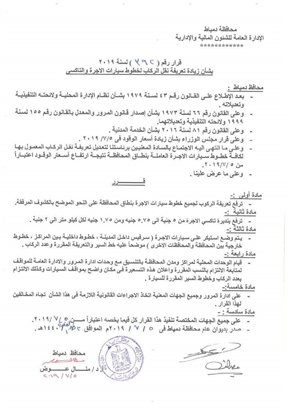 وفيما يلي بيان بالتعريفة المقررة لجميع سيارات الأجرة على مستوى المحافظة.