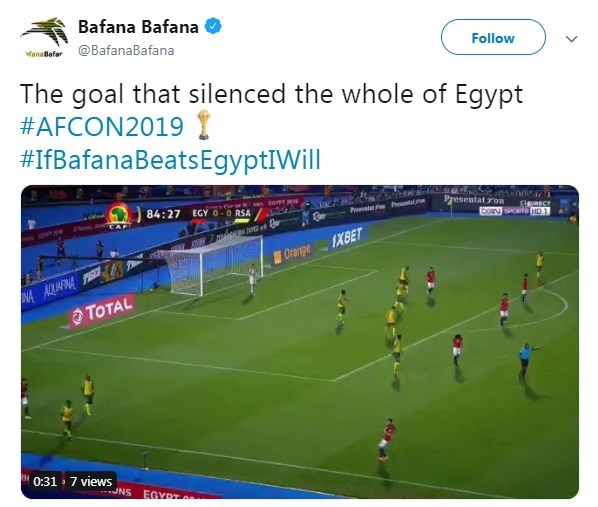 ونشر الحساب الرسمي لمنتخب جنوب إفريقيا على تويتر صورة هدف هدف اللاعب لورش وعلق: "الهدف الذي أسكت مصر".