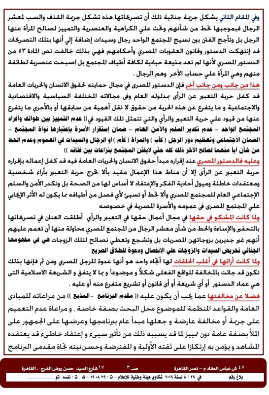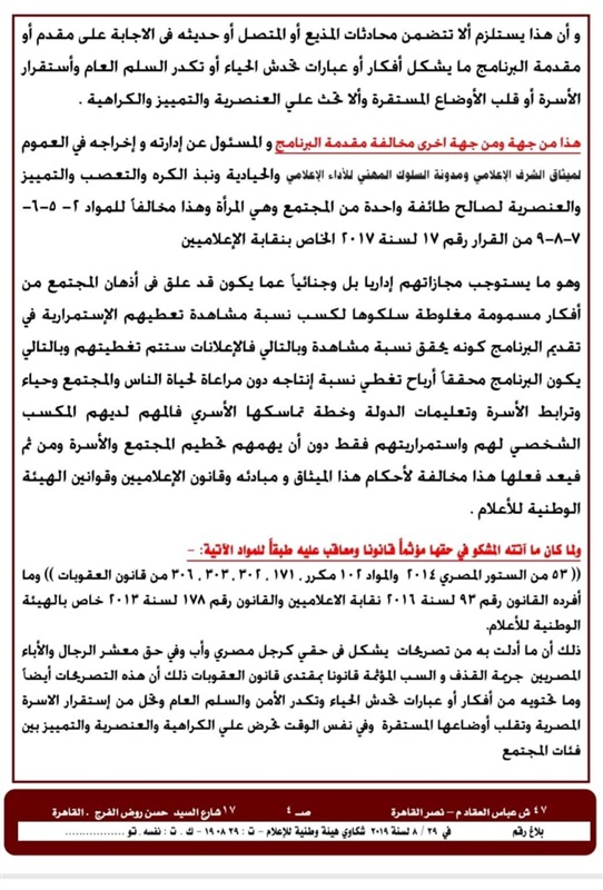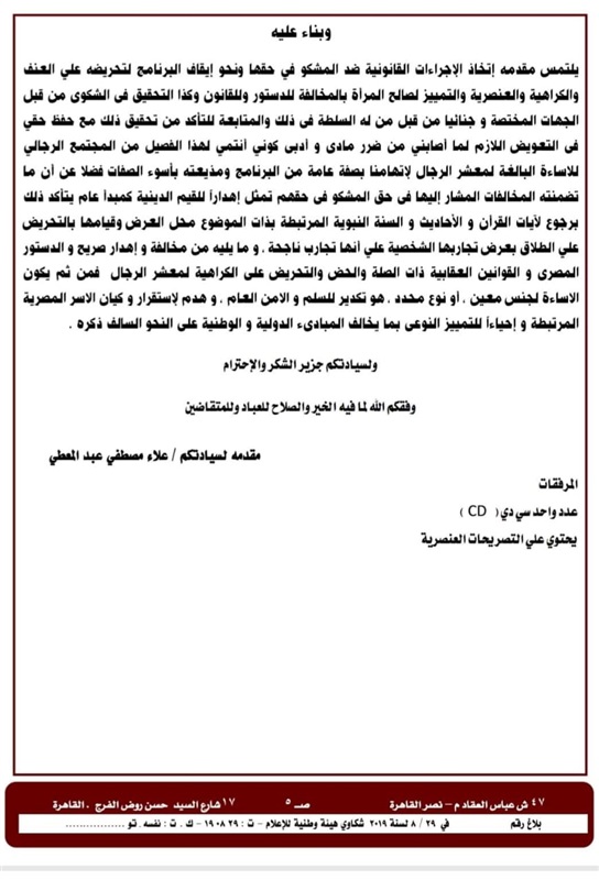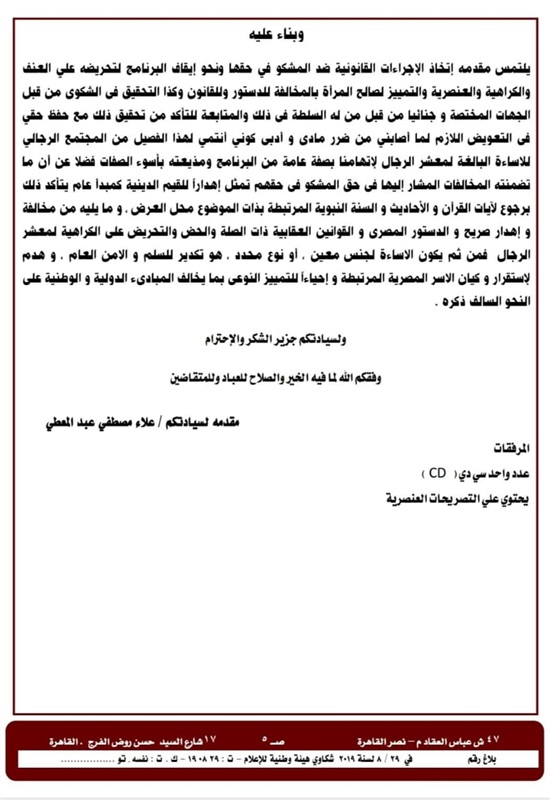 وأضاف المحامي في بلاغه أنهما يكدرون الأمن والسلم العام ويقذفون الرجال طبقا لنصوص قانون العقوبات، وأن تلك البرامج الذي محتواها يحرض على العنصرية والكراهية يؤثر فئة من المجتمع هي المرأة والمطلقة عن الفئة الأخرى هم الرجال والأزواج والآباء.