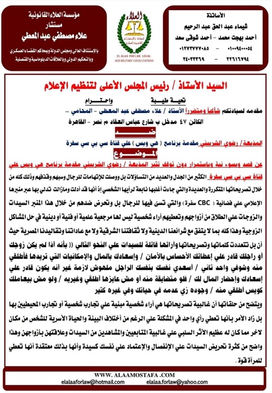 تقدم علاء مصطفى المحامي صاحب قضية حل وإلغاء المجلس القومي للمرأة لعدم الدستورية، ببلاغ للمجلس الأعلى للإعلام ضد كل من رضوى الشربيني مقدمة برنامج "هي وبس" ومفيدة شيحة مذيعة برنامج "الستات مبيعرفوش يكدبوا" لمخالفتهما ميثاق الشرف الإعلامي ومدونة السلوك المهني للأداء الإعلامي ونصوص الدستور وقانون العقوبات وذلك لتحريضهما للسيدات على الانفصال والطلاق ونقل تجاربهما الشخصية ونقلها على الشاشة في بث مباشر مما له من خطورة على المشاهدين.