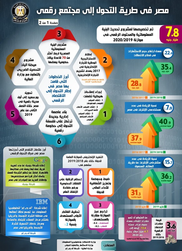 وأضاف المجلس، خلال إنفوجراف له، أن من أهم الخطوات تخصيص 7.8 مليار جنيه في موازنة 2019/2020 لمشروع تحديث البنية المعلوماتية والمحتوى الرقمي للدولة المصرية.