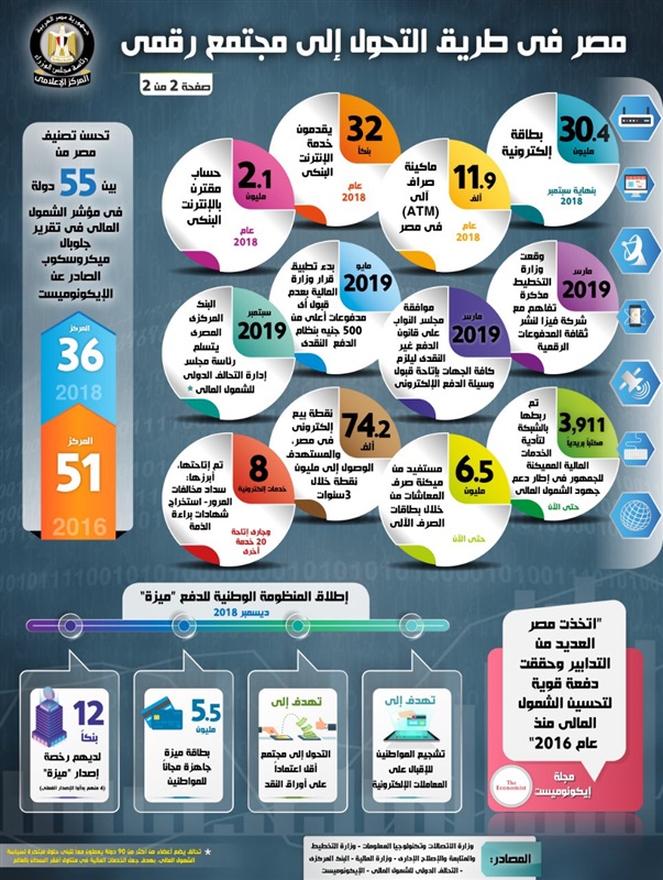 وفي نفس السياق، فقد جاء في الإنفوجراف, أن عدد ماكينات الصراف الآلي (ATM) في مصر قد بلغ 11.9 ألف ماكينة عام 2018،وفي مارس 2019 وافق مجلس النواب على قانون الدفع غير النقدي ليلزم كافة الجهات بإتاحة قبول وسيلة الدفع الإلكتروني،كما وقعت وزارة التخطيط مذكرة تفاهم مع شركة فيزا لنشر ثقافة المدفوعات الرقمية وذلك في مارس 2019 ، وأعلنت وزارة المالية في مايو 2019 بدء تطبيق قرارها بعدم قبول أي مدفوعات نقدية أعلى من 500 جنيه بنظام الدفع النقدي،وأخيراً تسلم البنك المركزي المصري رئاسة مجلس إدارة التحالف الدولي للشمول المالي في سبتمبر 2019.