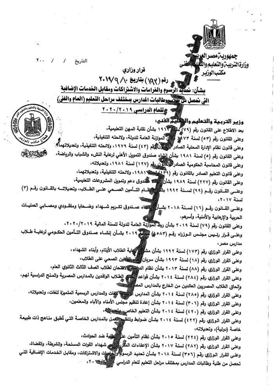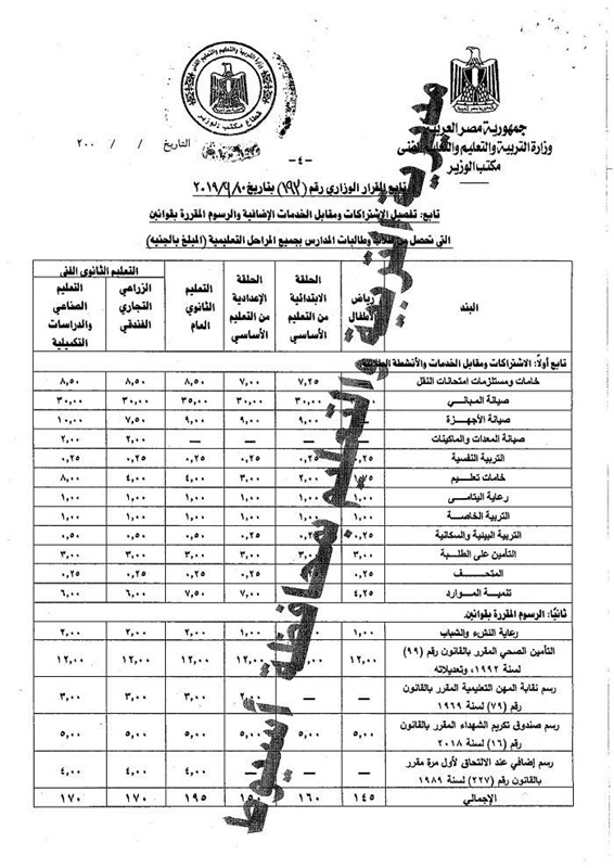 وجاء القرار رقم 193 لعام 2019 برسوم المراحل التعليمية كالآتي: