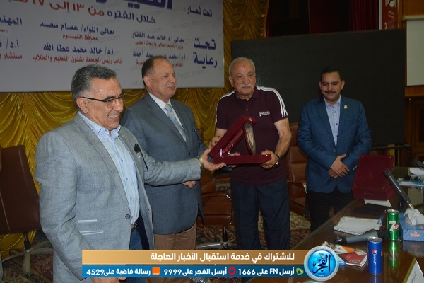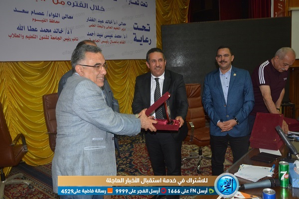 ومن جانبه قام الدكتور خالد عطا لله نائب رئيس الجامعة لشئون التعليم والطلاب بإهداء دروع التكريم للسادة الضيوف.